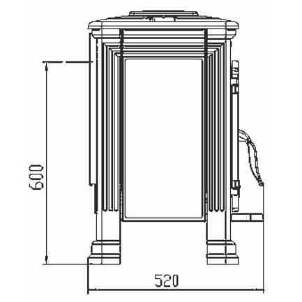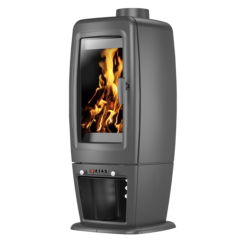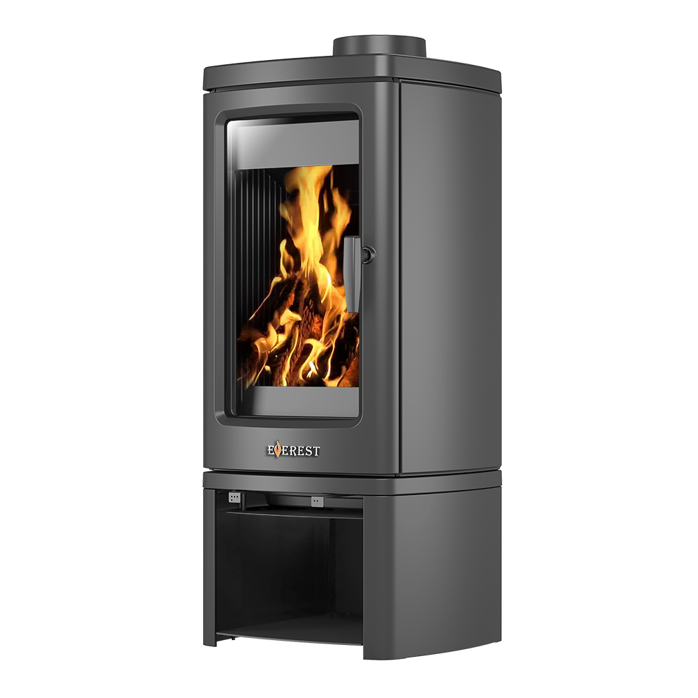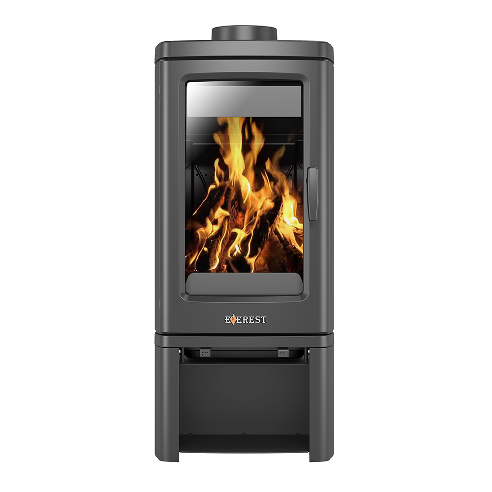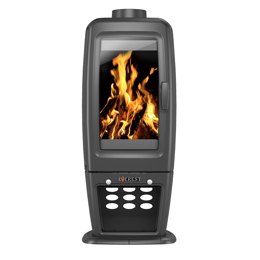 Печь-камин EVEREST S12 изготовлена из качественного жаростойкого чугуна с толщиной стенок 6-8мм. Вес печи составляет 182 кг. Модель рассчитана на обогрев помещений объёмом до 240м³. Печь-камин имеет два чугунных пламегасителя, обеспечивающие высокий КПД печи. Топка печи-камина усилена чугунными вставками с системой четырехуровневого вторичного дожига. С помощью этой функции по каналам подачи вторичного воздуха поступает воздух, который нагревается при прохождении между топочной камерой и стенками корпуса. Далее нагретый воздух через дефлектор поступает в топку, перемешивается с газами - продуктами горения, чем вызывает повторное возгорание. Регулировка этой системы, как и подача воздуха в колосниковую зону осуществляется рычагом, расположенным слева в нижней части печи-камина. В правой нижней части расположена ручка регулировки системы чистое стекло, которая препятствует оседанию сажи на внутреннюю поверхность стекла.