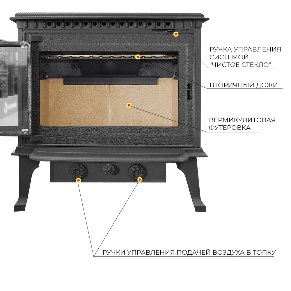 Над дверцей печи-камина расположена система чистое стекло, которая помогает оставаться стеклу чистым. В нижней части под топкой расположены две вращающиеся заслонки для регулировки подачи воздуха в колосниковую зону, которые помогают контролировать интенсивность горения.