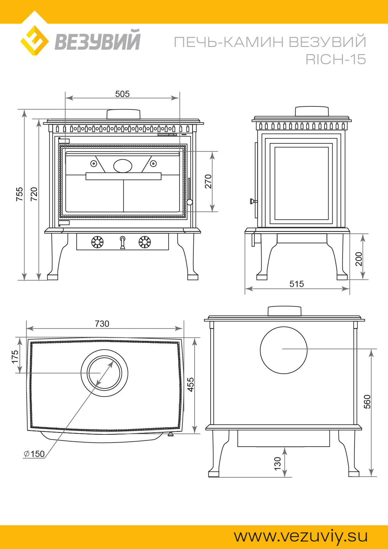 Печь-камин Везувий RICH-15 изготовлена из качественного жаростойкого чугуна с толщиной стенок 6-8 мм. Топка футерована вермикулитом, Модель рассчитана на обогрев помещений объёмом до 300 м³. Вес 170кг.